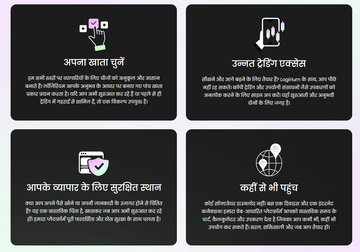 ट्रेडिंग ऐप्स से भरे इस बाज़ार में, Logirium ने अपनी एक अलग पहचान बनाई है। यह एक्सेसिबिलिटी और सोफिस्टिकेशन का मिश्रण है, जो हर स्तर के ट्रेडर्स के लिए आकर्षक बनाता है। शक्तिशाली टूल्स, व्यापक एसेट चयन, अनुकूलित अकाउंट विकल्प और मज़बूत शैक्षिक संसाधनों के साथ, यह प्लेटफ़ॉर्म सिर्फ़ ट्रेडिंग का स्थान नहीं है बल्कि यह एक ट्रेडर की वित्तीय यात्रा का साथी बन जाता है।